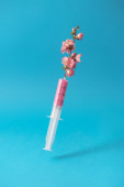 Creative Coronavirus lub szczepionka COVID-19. Wiosna Natura kreatywny pomysł. Zespół oddechowy wirusa epidemii. Strzykawka z białymi kwiatami róż. Minimalne zaplecze pandemii.