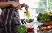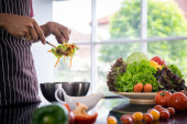 Zdjęcie "Czyste świeże organiczne warzywa wprowadzone do szklanej miski przez ręce szefa kuchni, aby przygotować naturalny składnik do gotowania zdrowej żywności wegańskiej. Kuchnia menu dojrzałe owoce, pomidory, cebula, papryka na stole kuchennym." może być wykorzystywane do celów osobistych i komercyjnych zgodnie z warunkami zakupionej licencji Royalty-free. Obraz jest dostępny do pobrania w jakości wysokiej rozdzielczości do 5760x3840.