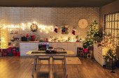 Boże Narodzenie w domu pokój z choinką i świąteczne oświetlenie bokeh, na tle kuchnia urządzone na wakacje. Boże Narodzenie i Nowy Rok wnętrze zamazane tło. Wiele świateł, które świecą w ciemności..