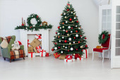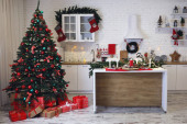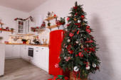 Boże Narodzenie w domu pokój z choinką i świąteczne oświetlenie bokeh, na tle kuchnia urządzone na wakacje. Boże Narodzenie i Nowy Rok wnętrze zamazane tło. Wiele świateł, które świecą w ciemności..