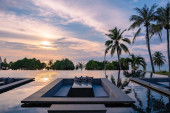para mężczyzna i kobieta oglądający zachód słońca z dachu basenu infinity na luksusowych wakacjach