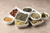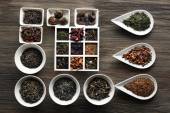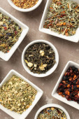 Płaska leżała z różnymi rodzajami herbaty na teksturowanym tle
