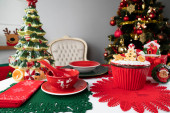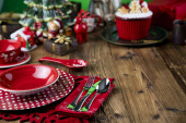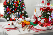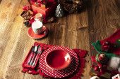Świąteczne tło. Świąteczne zastawy stołowe i dekoracje na stole.