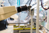Zdjęcie "Produkcja przędzy bawełnianej w fabryce włókienniczej. Pracownica rąk kobiety w pracy. Wiersz automatycznych maszyn do produkcji przędzy. Nowoczesna fabryka tekstyliów.." może być wykorzystywane do celów osobistych i komercyjnych zgodnie z warunkami zakupionej licencji Royalty-free. Obraz jest dostępny do pobrania w jakości wysokiej rozdzielczości do 5760x3840.