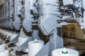 Biała przędza tekstylna. maszyny i urządzenia w fabryce tekstyliów..