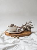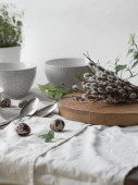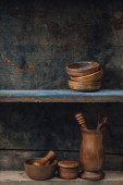 Zdjęcie "Stylowe brązowe gliniane miski na kamieniu i dryfujące drewno na szarym tle. Z przodu. Odbiór." może być wykorzystywane do celów osobistych i komercyjnych zgodnie z warunkami zakupionej licencji Royalty-free. Obraz jest dostępny do pobrania w jakości wysokiej rozdzielczości do 5760x3840.