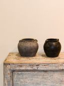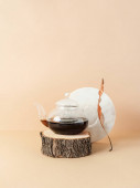 Stylowe brązowe gliniane miski na kamieniu i dryfujące drewno na szarym tle. Z przodu. Odbiór.