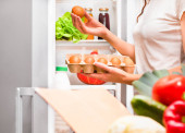 pudełko tekturowe z jedzeniem na pierwszym planie, kobieta wkłada jedzenie do lodówki w tle