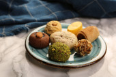 Grupa różnorodnych ciasteczek. Chipsy czekoladowe, rodzynki owsiane, biała czekolada