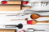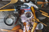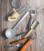 Różne vintage akcesoria kuchenne wiszące na hakach na ścianie, niezbędne naczynia do domowego gotowania