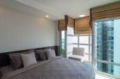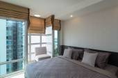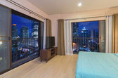 Luksusowa sypialnia wewnętrzna z oknami szklanymi obok rzeki Bangkok Cityscape w nocy, dom towarowy Iconsiam, hotel, relaks i wakacje, uroczystości w szczęśliwym Nowym Roku i Wesołych Świąt koncepcji
