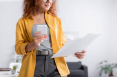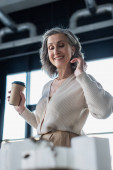Bizneswoman w średnim wieku w płaszczu i okularach trzymając teczkę papieru i kawy na zewnątrz