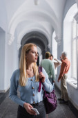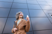 Dojrzała bizneswoman w płaszczu rozmawia przez telefon komórkowy i trzyma dokumenty w pobliżu budynku na zewnątrz