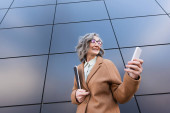 Dojrzała bizneswoman w okularach trzyma telefon komórkowy i papiery na zewnątrz