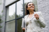 Bizneswoman w średnim wieku w płaszczu rozmawia przez telefon komórkowy i trzyma dokumenty podczas spaceru ulicą miejską