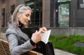 Zdjęcie "Dojrzała bizneswoman w płaszczu trzymając teczkę papieru i smartfona patrząc z dala na ulicy miejskiej " może być wykorzystywane do celów osobistych i komercyjnych zgodnie z warunkami zakupionej licencji Royalty-free. Obraz jest dostępny do pobrania w jakości wysokiej rozdzielczości do 5760x3840.