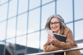 Uśmiechnięta bizneswoman w płaszczu za pomocą smartfona i trzymając kawę, aby przejść na ulicę miejską