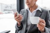 Dojrzała bizneswoman w płaszczu i okularach rozmawia na smartfonie i trzyma kawę na świeżym powietrzu