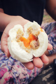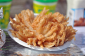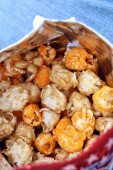 karmelowa przekąska z popcornu w torbie na rękę i butach