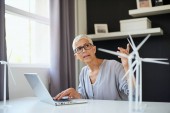 Uśmiechnięta bizneswoman trzymająca komórkę w pobliżu modeli budynków i turbin wiatrowych w biurze