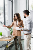 Widok z boku uśmiechniętej bizneswoman trzymającej plan w pobliżu modeli budynków w biurze