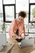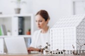 Bizneswoman w średnim wieku za pomocą laptopa w pobliżu modelu budynku i planu w biurze
