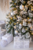 Biały śnieg choinka z prezentami wystrój wnętrz domu, Nowy rok