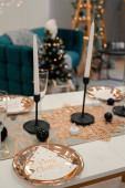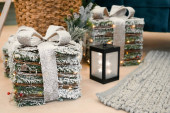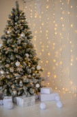 Piękny świąteczny wystrój z lampkami i zabawkami na betonowym tle