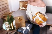 Portret kobiety w średnim wieku medytującej przy kanapie i choince