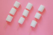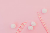 Dziewięć białych świec i dwa pączki z cukrem pudrem w spodkach leżą na różowym tle z przestrzenią do kopiowania, zbliżenie. Koncepcja świętowania Chanuki.