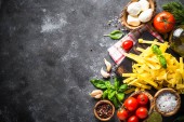 Zdjęcie "Składniki makaronu na czarnym tle widok z góry." może być wykorzystywane do celów osobistych i komercyjnych zgodnie z warunkami zakupionej licencji Royalty-free. Obraz jest dostępny do pobrania w jakości wysokiej rozdzielczości do 5760x3840.