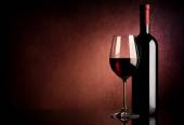 Czerwony kieliszek i butelka na czerwonym tle z miejscem do kopiowania