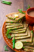 Zdjęcie "Paneer paratha to popularny północnoindyjski placek z mąki pszennej, nadziewany pikantnym, przyprawionym, tartym paneerem." może być wykorzystywane do celów osobistych i komercyjnych zgodnie z warunkami zakupionej licencji Royalty-free. Obraz jest dostępny do pobrania w jakości wysokiej rozdzielczości do 5760x3840.