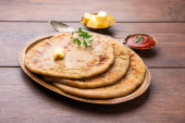 Zdjęcie "Paneer paratha to popularny północnoindyjski placek z mąki pszennej, nadziewany pikantnym, przyprawionym, tartym paneerem." może być wykorzystywane do celów osobistych i komercyjnych zgodnie z warunkami zakupionej licencji Royalty-free. Obraz jest dostępny do pobrania w jakości wysokiej rozdzielczości do 5760x3840.