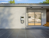 3d renderowania budynku domu ekologicznego i zielonej energii składa się z ogniwa słonecznego lub ogniwa fotowoltaicznego w gontach słonecznych i szafie elektrycznej. Technologia systemu do generowania energii elektrycznej w nocy.