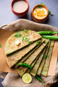 Zdjęcie "Paneer paratha to popularny północnoindyjski placek z mąki pszennej, nadziewany pikantnym, przyprawionym, tartym paneerem." może być wykorzystywane do celów osobistych i komercyjnych zgodnie z warunkami zakupionej licencji Royalty-free. Obraz jest dostępny do pobrania w jakości wysokiej rozdzielczości do 5760x3840.
