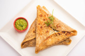 Zdjęcie "Paneer paratha to popularny północnoindyjski placek z mąki pszennej, nadziewany pikantnym, przyprawionym, tartym paneerem." może być wykorzystywane do celów osobistych i komercyjnych zgodnie z warunkami zakupionej licencji Royalty-free. Obraz jest dostępny do pobrania w jakości wysokiej rozdzielczości do 5760x3840.