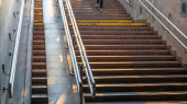 Schody w przejściu podziemnym. Schody do wolności. Promienie słońca na schodach. Nowe koncepcje życia. Streszczenie tła.