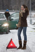 Ładna, młoda kobieta zakładająca trójkąt ostrzegawczy i wzywająca pomocy po tym, jak jej samochód zepsuł się na pustkowiu w mroźny zimowy dzień.