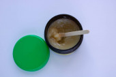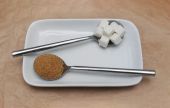 Szklany słoik z cukrem i łyżką na czarnym drewnianym stole.