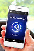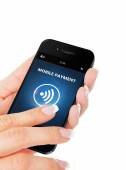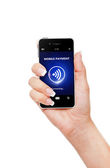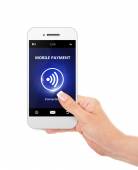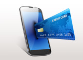 telefon komórkowy z kartą kredytową przechowywany przez strony na białym tle nad białym