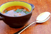 Zupa grzybowa w niebieskiej ceramicznej misce na serwetce, na drewnianym stole jadalnym. Gotowanie domowe