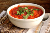 Zupa grzybowa w niebieskiej ceramicznej misce na serwetce, na drewnianym stole jadalnym. Gotowanie domowe