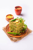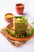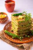 Parathas groszek zielony lub flatbread lub matar parathas z twarogu i gorącej herbaty
