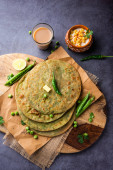 Parathas groszek zielony lub flatbread lub matar parathas z twarogu i gorącej herbaty