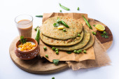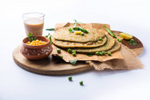 Parathas groszek zielony lub flatbread lub matar parathas z twarogu i gorącej herbaty