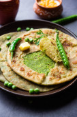 Parathas groszek zielony lub flatbread lub matar parathas z twarogu i gorącej herbaty