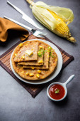 Parathas groszek zielony lub flatbread lub matar parathas z twarogu i gorącej herbaty