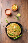 Parathas groszek zielony lub flatbread lub matar parathas z twarogu i gorącej herbaty