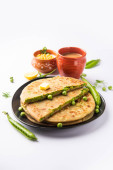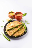 Parathas groszek zielony lub flatbread lub matar parathas z twarogu i gorącej herbaty
